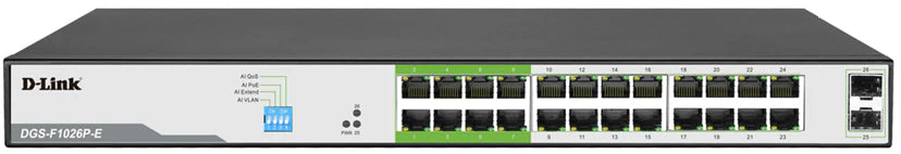 - Extended 250m Range: The DGS-F1026P supports an extended range of up to 250 meters on its PoE ports when in "Extend Mode." This extended reach is particularly useful in large buildings, campuses, or areas where devices are located far from the network hub.